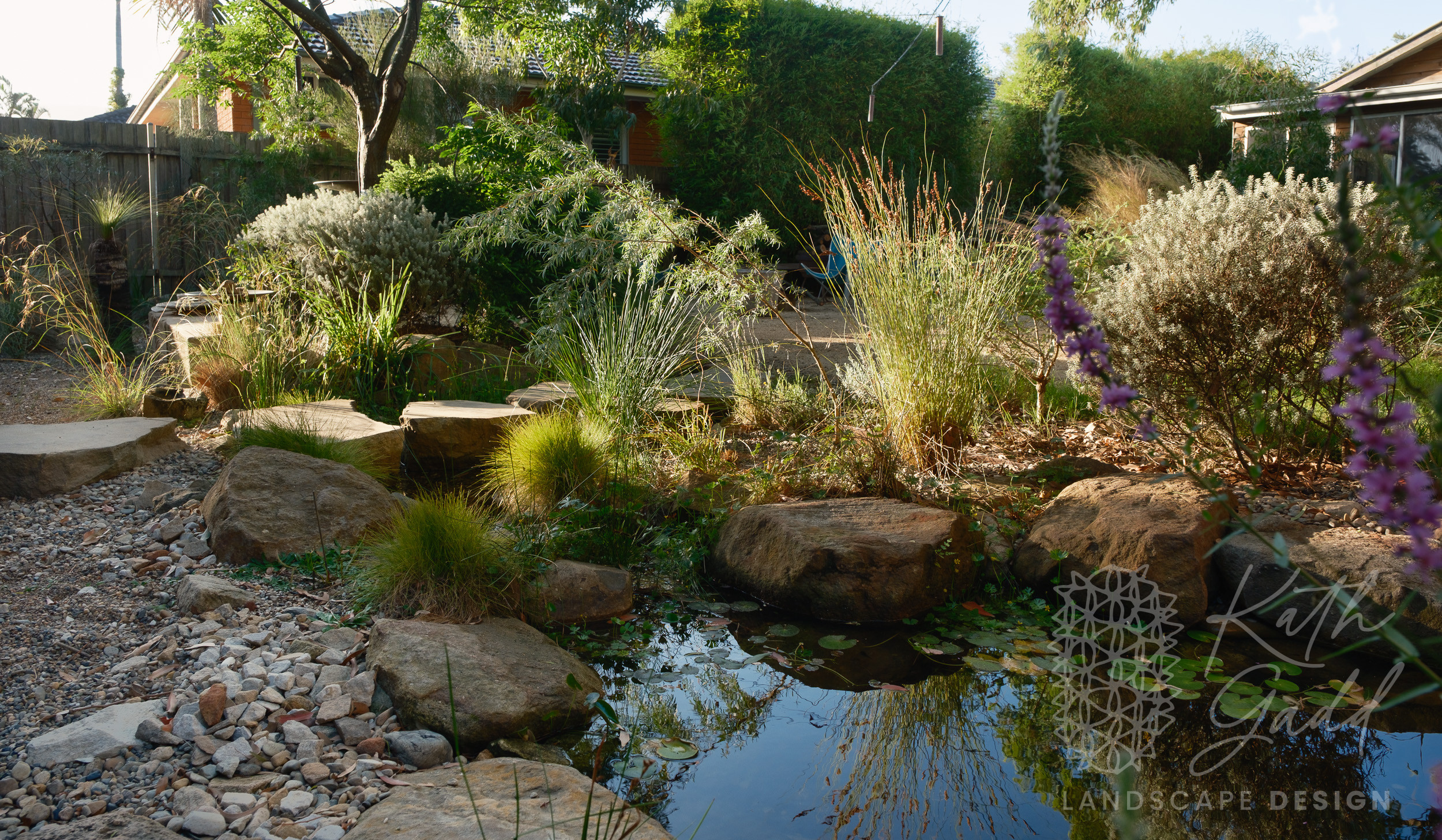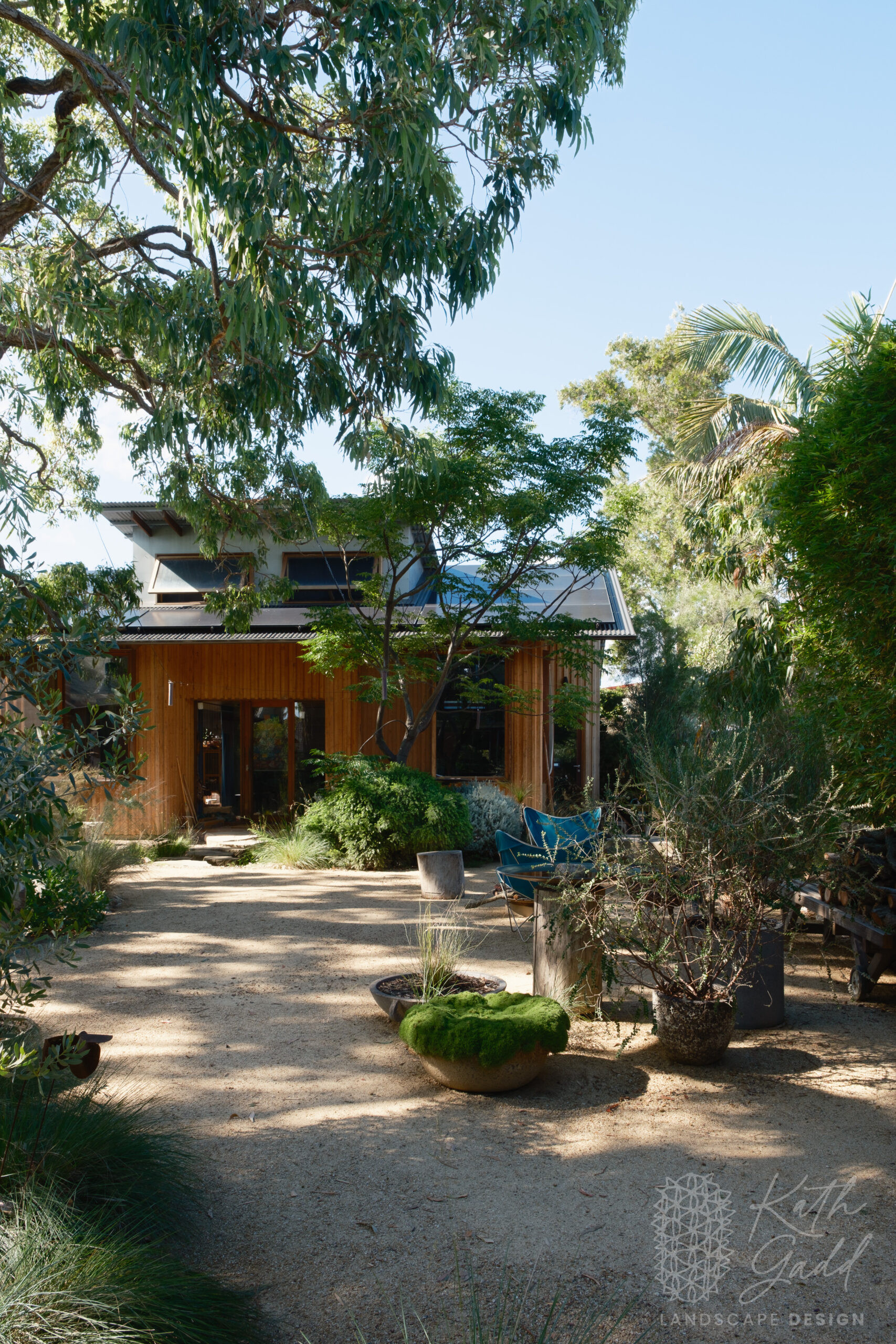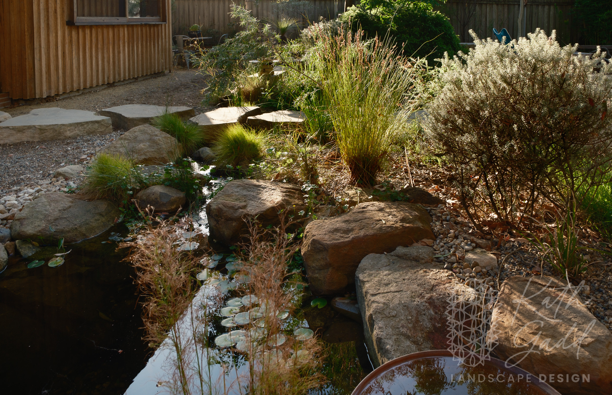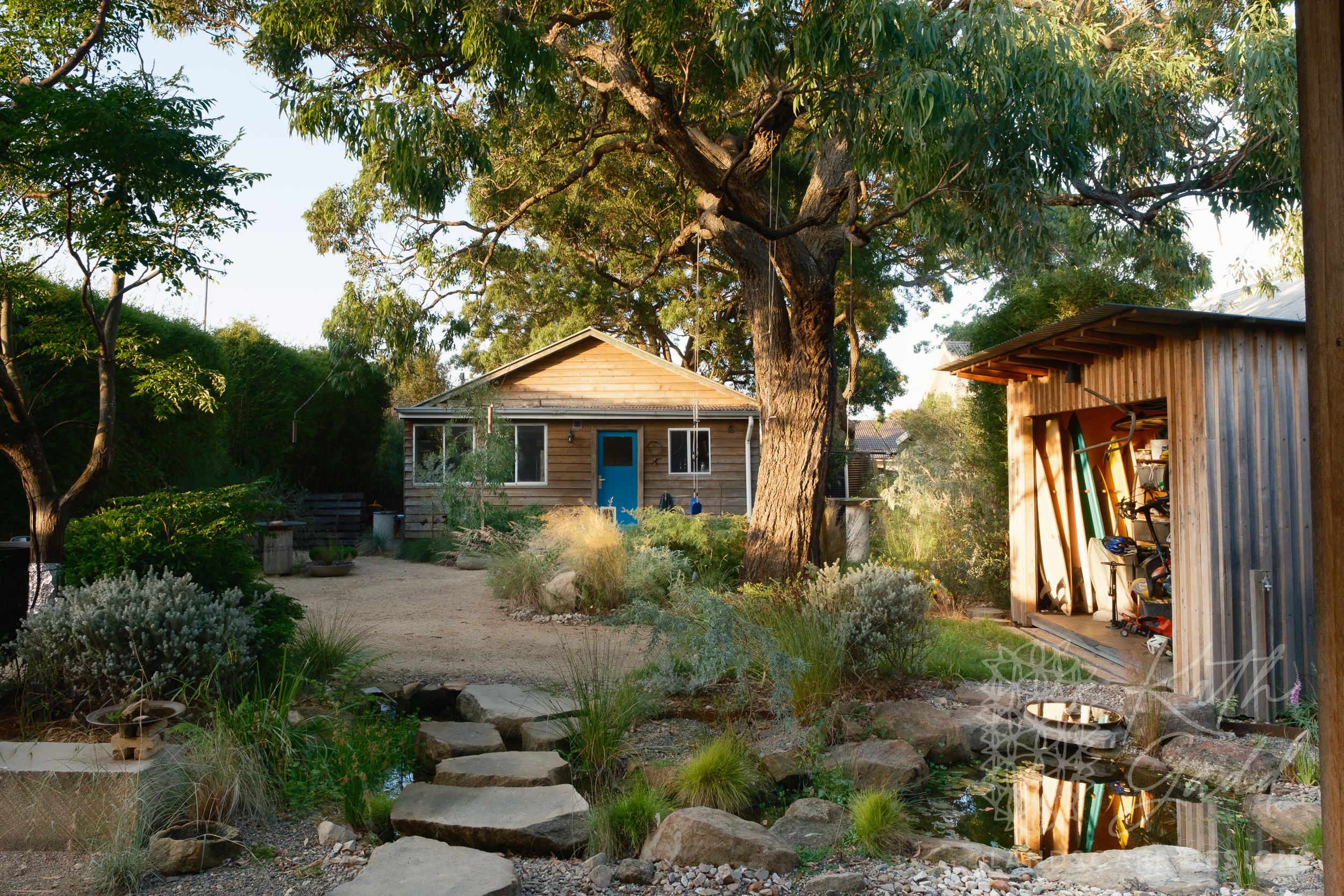 This is my garden, my place of experimentation and play. I live in a coastal suburb of Northern Illawarra, under the canopy of several indigenous Eucalyptus paniculata. I have clay soils, plenty of coastal winds and neighbours tight up against all boundaries. I like to pretend I live in the bush. My partner designed and built the rear house as a garden house, with large sliding windows framing the views. We live in the garden between the two houses in a somewhat courtyard archetype. The garden has evolved over many years now with the frog pond being the latest edition.